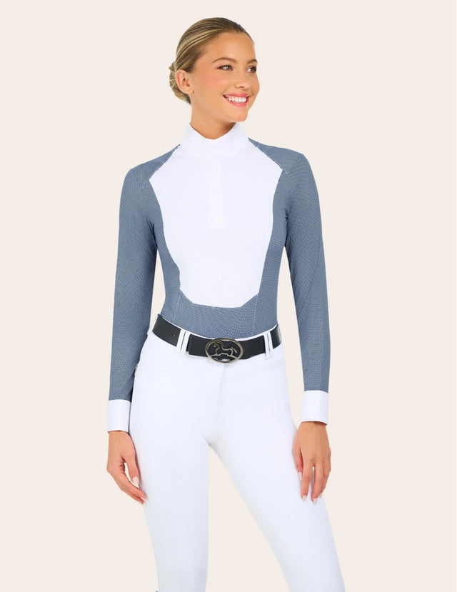 The Liv show shirt is designed to bring additional style and versatility to the show ring. Modern seam lines and silky, cooling fabric ensures that rider’s stay comfortable and confident. The unique prints, paired with a white collar and front bib, elevate its style without compromising the classic look under a show coat.