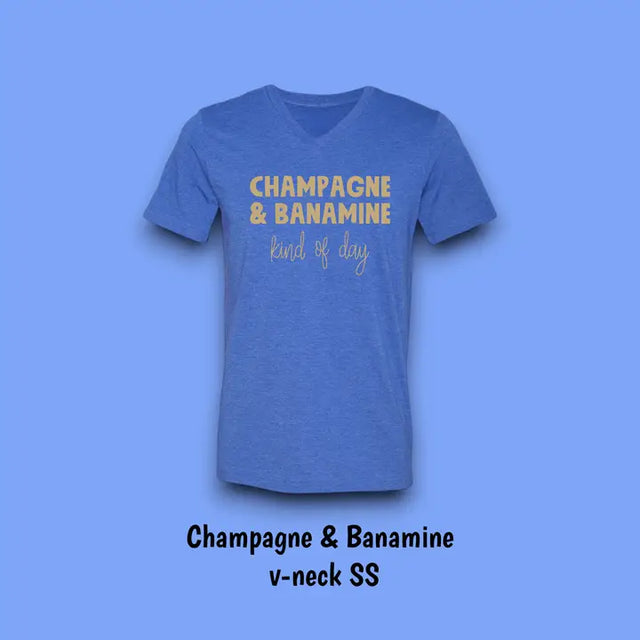 "CHAMPAGNE & BANAMINE" V-NECK TEE By Equine & Design - XS / HEATHER ROYAL is backordered and will ship as soon as it is back in stock.